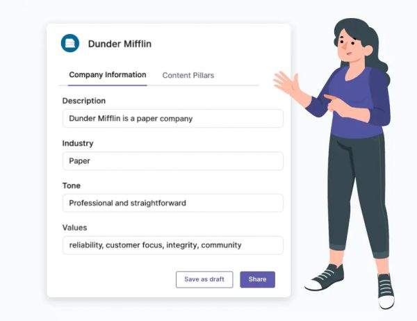 Marketing bepaalt de merktoon, contentthema’s en campagnedoelen. De postsuggesties volgen deze instellingen, maar laten medewerkers wel toe om ze aan te passen naar hun eigen toon en perspectief.